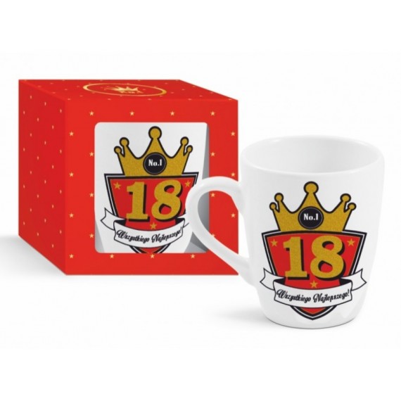 Kubek ceramiczny o pojemności 300ml zapakowany w czerwony prezentowy kartonik.