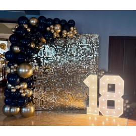 Istnieje możliwość wybrania dowolnej kolorystyki girlandy z balonów oraz cyfry i nadruku na tablicy zawieszonej na ściance.