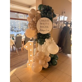 Istnieje możliwość wybrania dowolnej kolorystyki girlandy z balonów oraz cyfry i nadruku na tablicy zawieszonej na ściance.